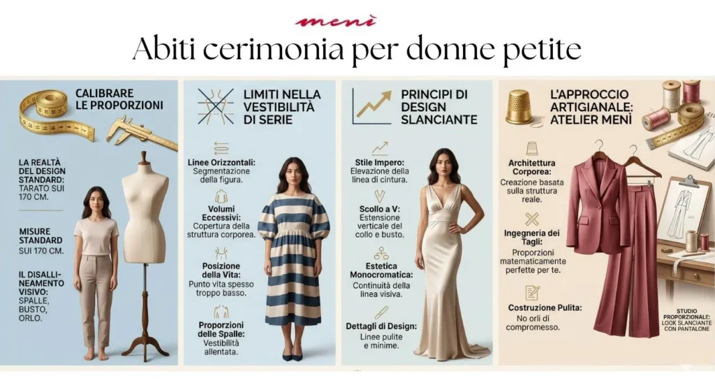 Quando cerchi un abito elegante e sei una donna di statura minuta, il tuo problema non è mai la taglia. Puoi anche trovare la misura apparentemente perfetta per te, ma se quel capo è stato progettato sulle proporzioni di una figura alta un metro e settanta, la relazione geometrica tra il tuo punto vita, la lunghezza del tuo busto e la caduta del tessuto sarà inevitabilmente sbilanciata. Un abito da cerimonia petite diventa armonico e capace di slanciarti solo quando ogni sua linea viene calibrata sul tuo esatto baricentro anatomico.